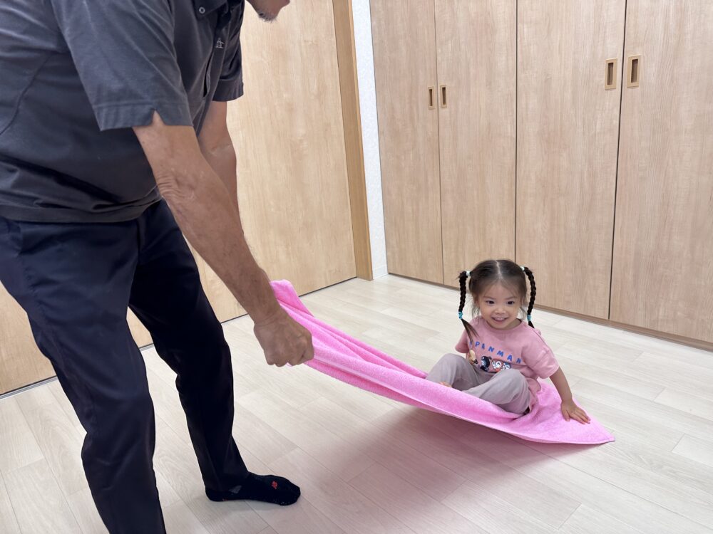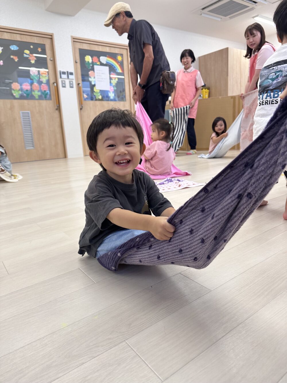 バスタオルに乗ったこどもたちをひっぱってもらったり♪