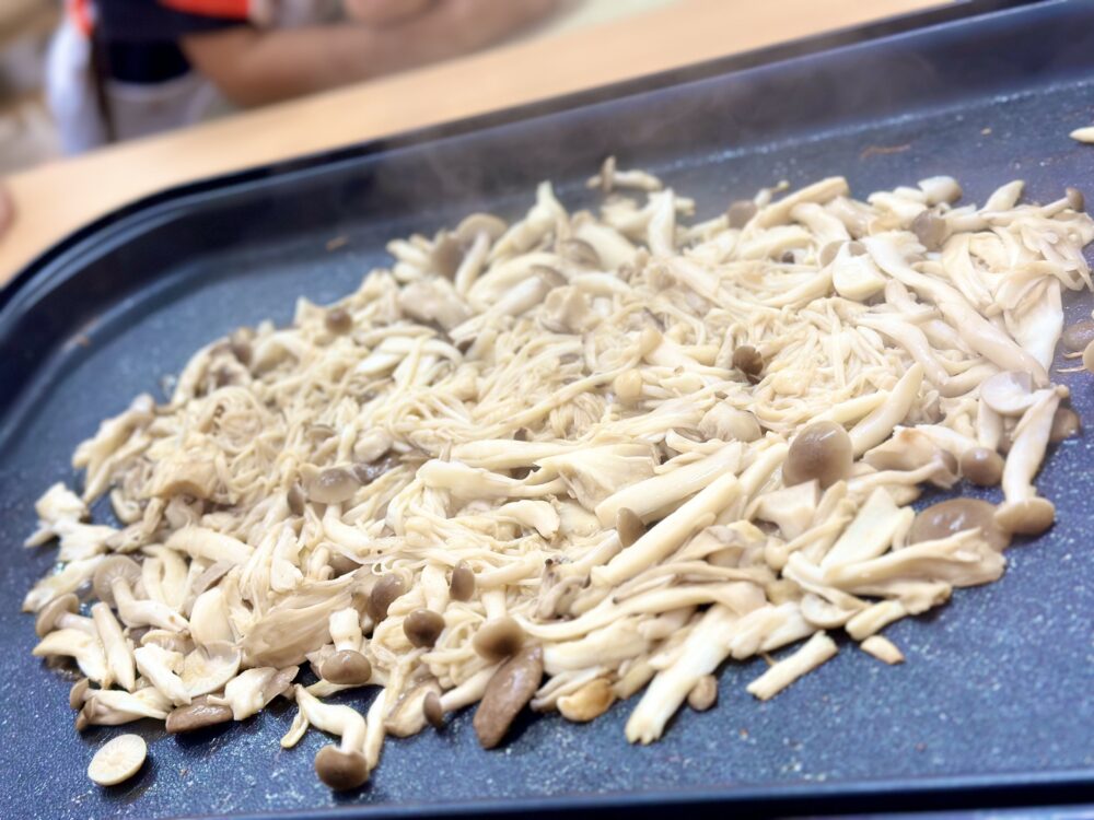 自分たちでちぎったきのこは、目の前で調理しました。ホットプレートでちぎったきのこを炒めてホールがとてもいい香りに包まれ、変わっていくきのこの様子を子どもたちは興味津々に見ていました!