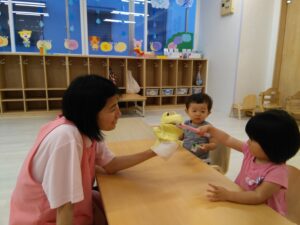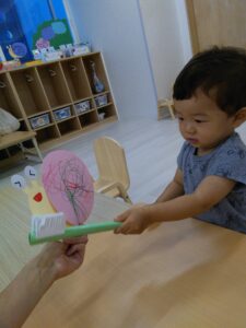 虫歯、歯磨きの話をしてカエルやカタツムリの歯をしっかり磨きました。