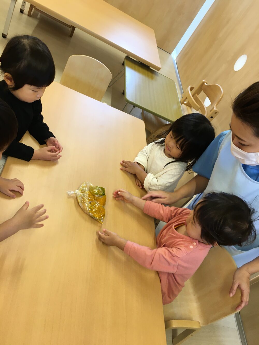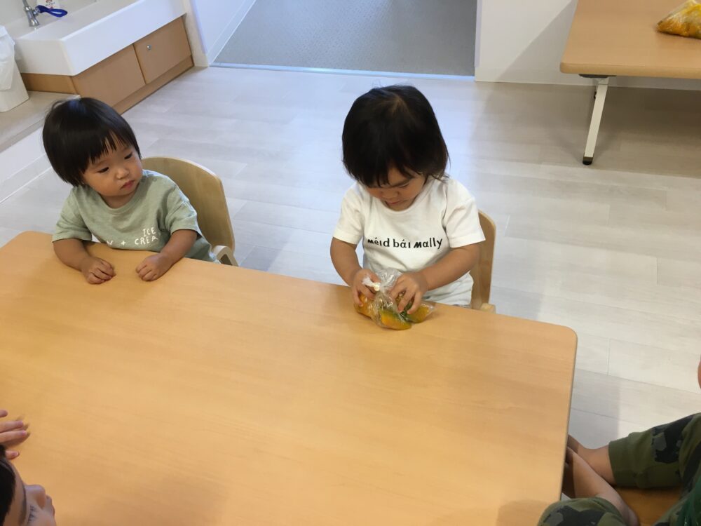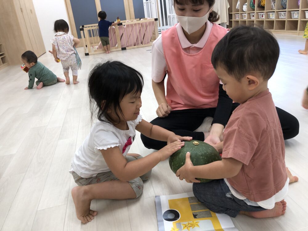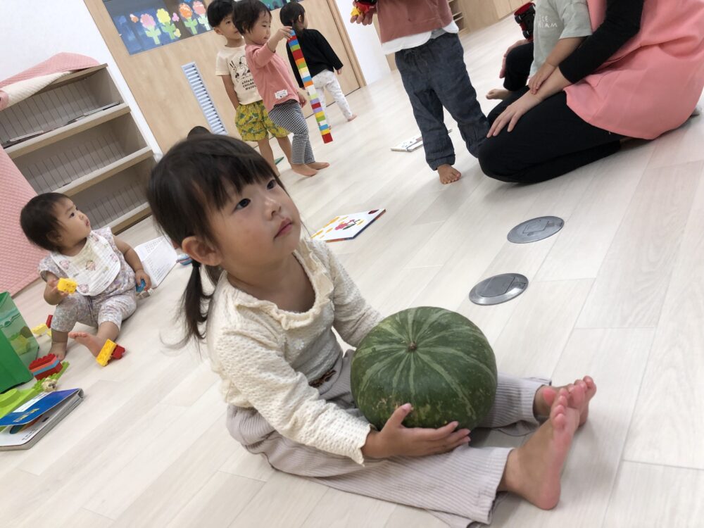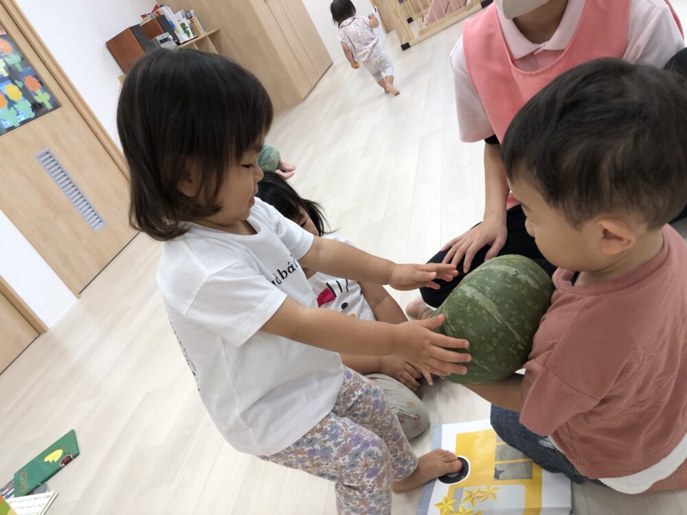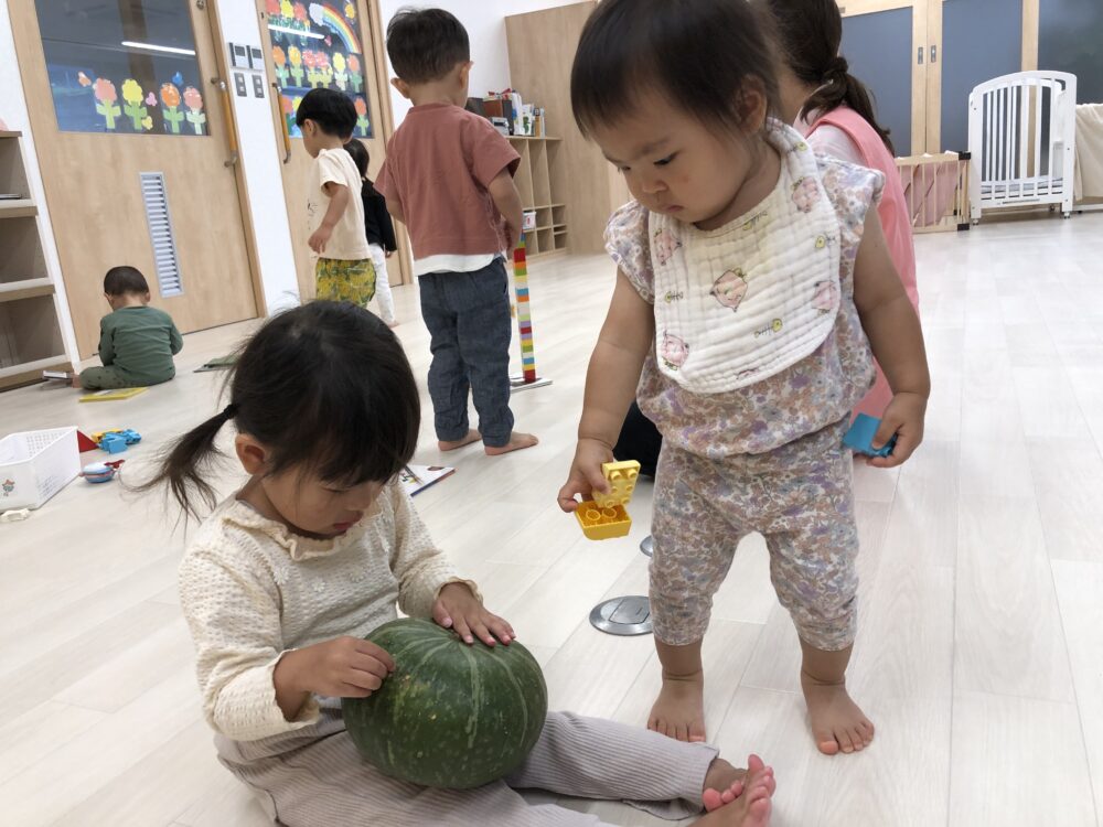 朝元気よく登園してきた子から順にかぼちゃを触ってみました(^▽^)