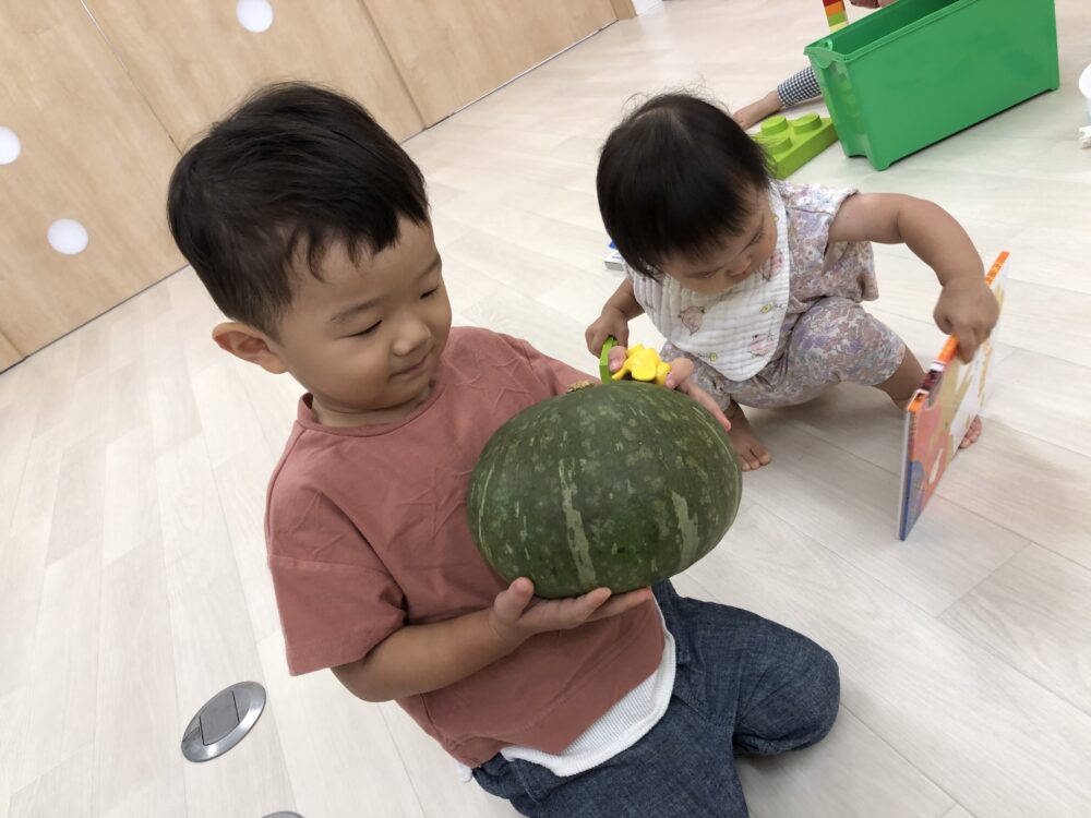 「おっき~い!」「かたいね」と言ったり、コンコンとかぼちゃを優しくノックする可愛い姿も見られました♡