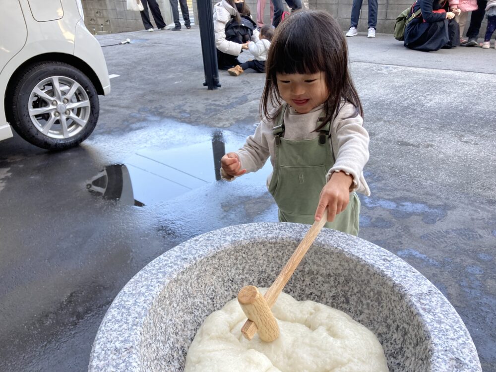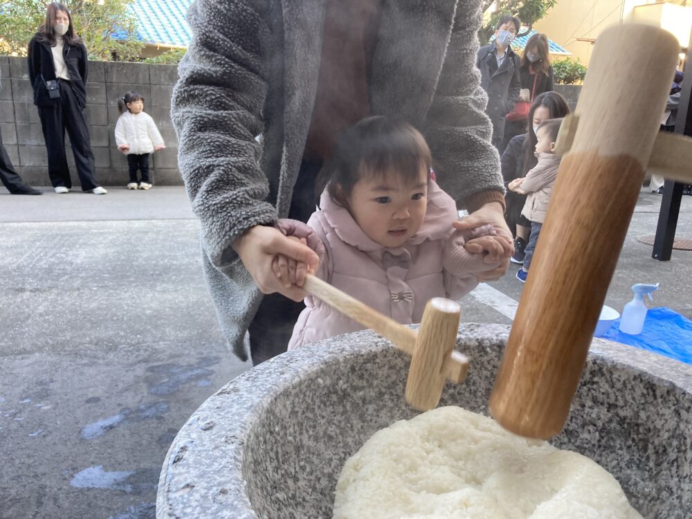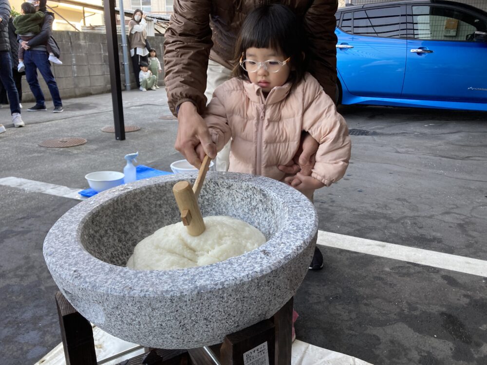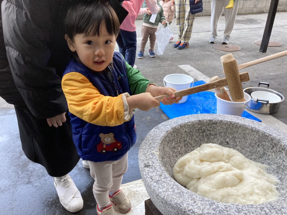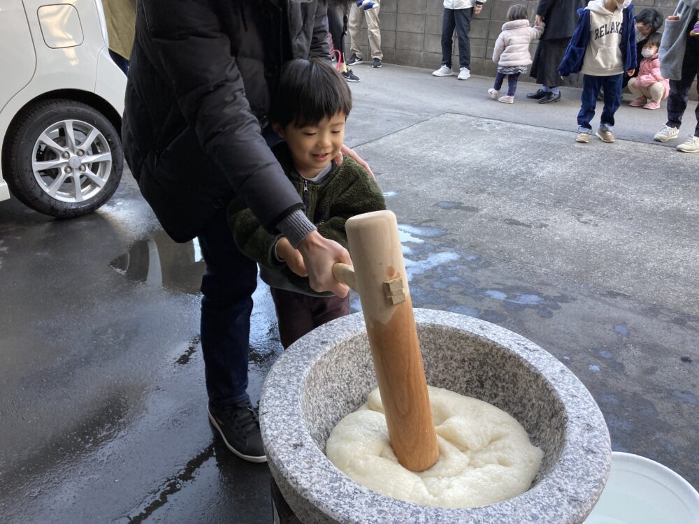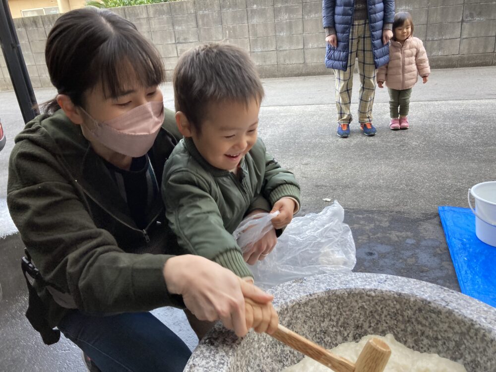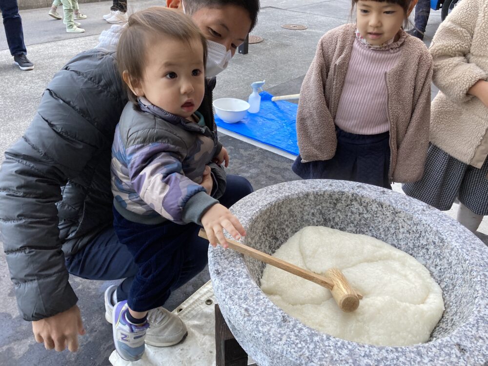子どもサイズの杵を持ち、「よいしょ!よいしょ!」と 頑張っておもちをついた子どもたちです(^^♪