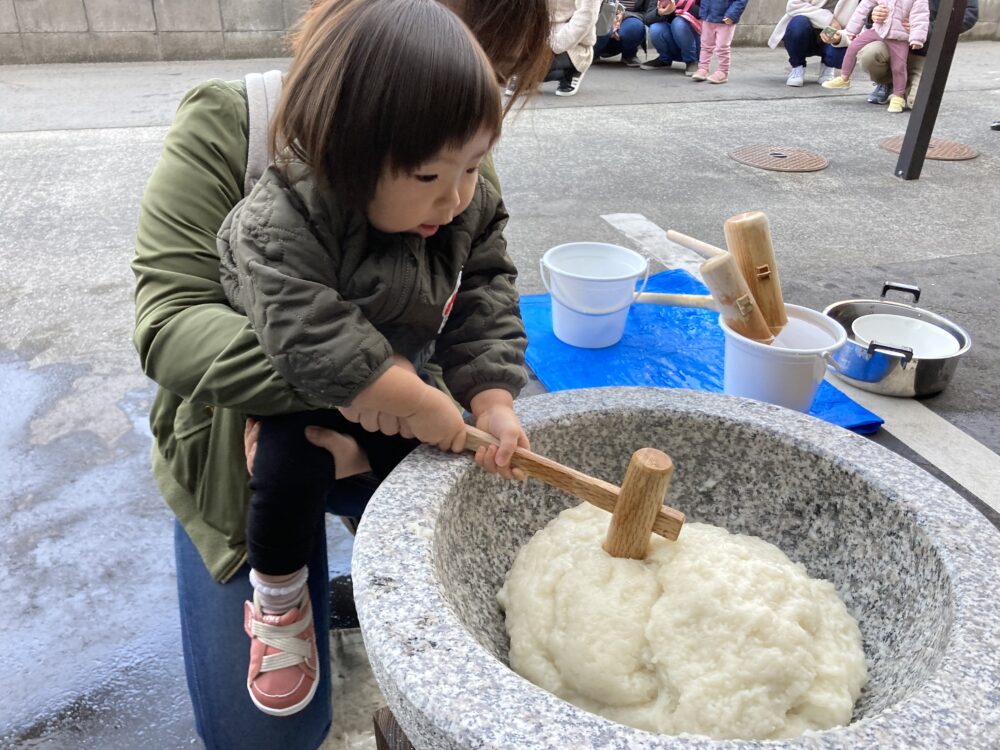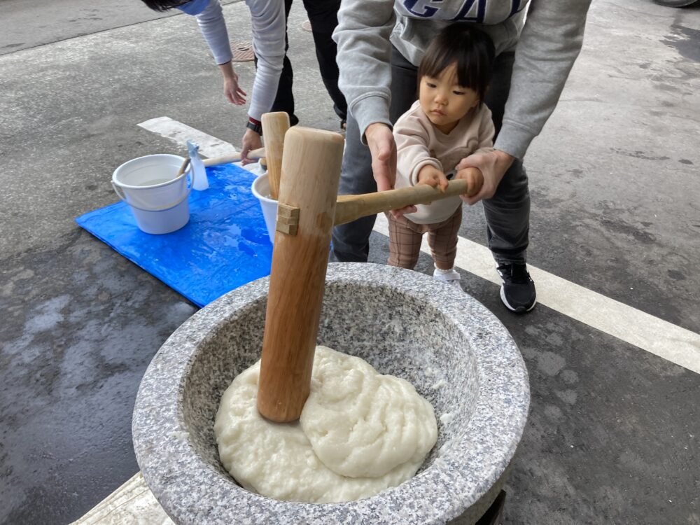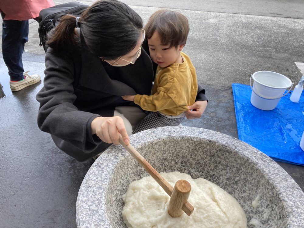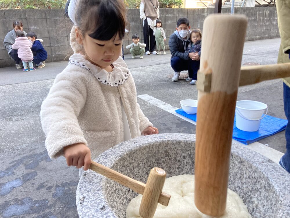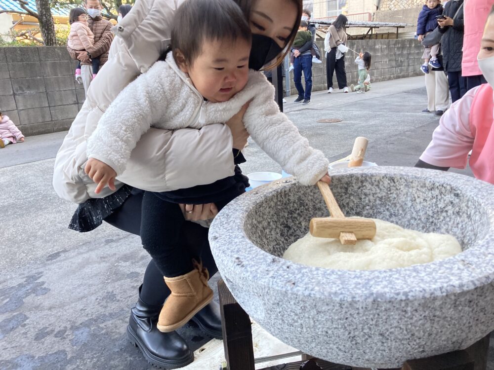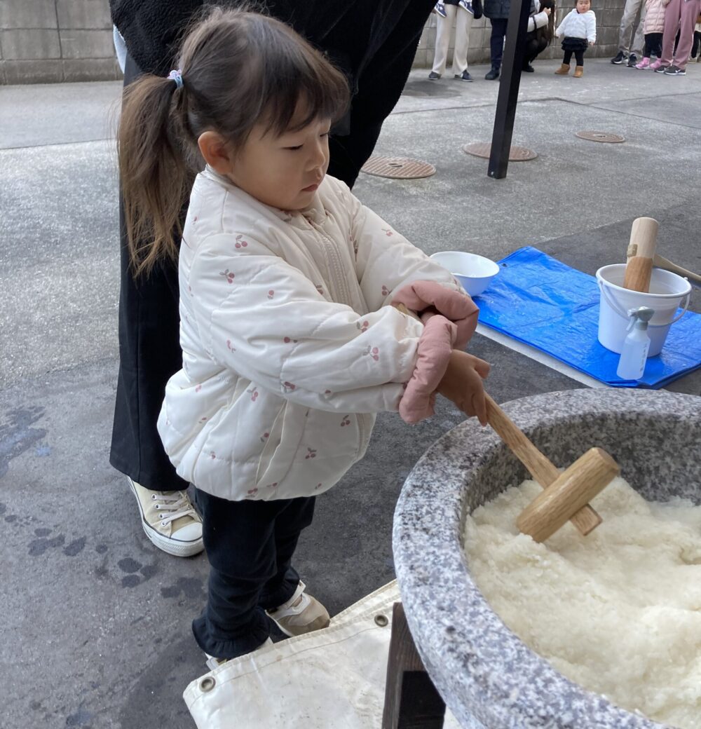 子どもサイズの杵を持ち、「よいしょ!よいしょ!」と 頑張っておもちをついた子どもたちです(^^♪