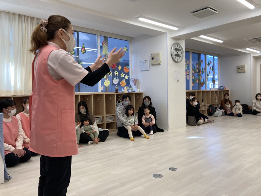 ホールに集まると、壁には春~冬までの園での様子の写真がズラリ☆