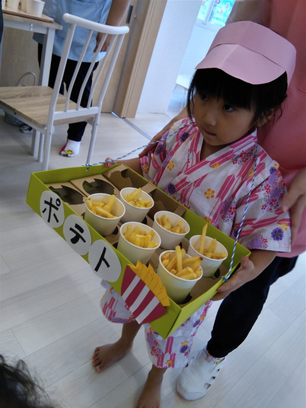 可愛い売り子のお姉さんにポテトをもらって大喜びの子どもたち!お家の人や、お友だちと楽しくお話をしながら食べました(^O^)