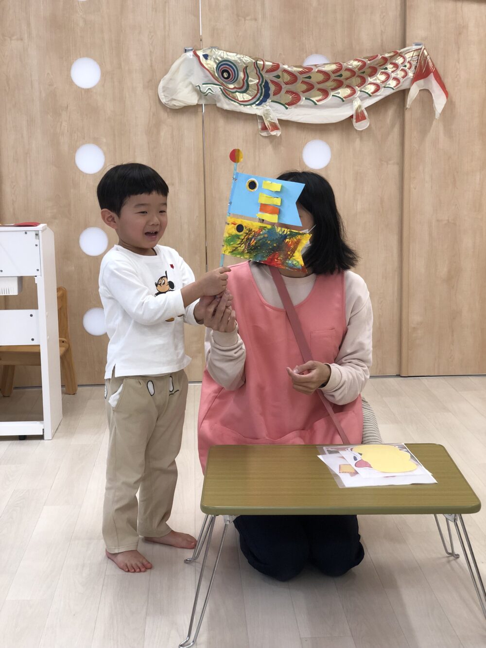 「違うー!」と言い、鯉のぼりが登場すると「ピンポーン!」と大きな丸