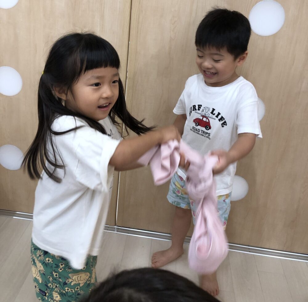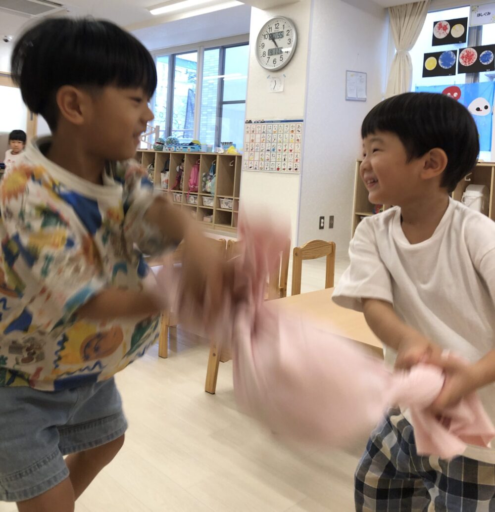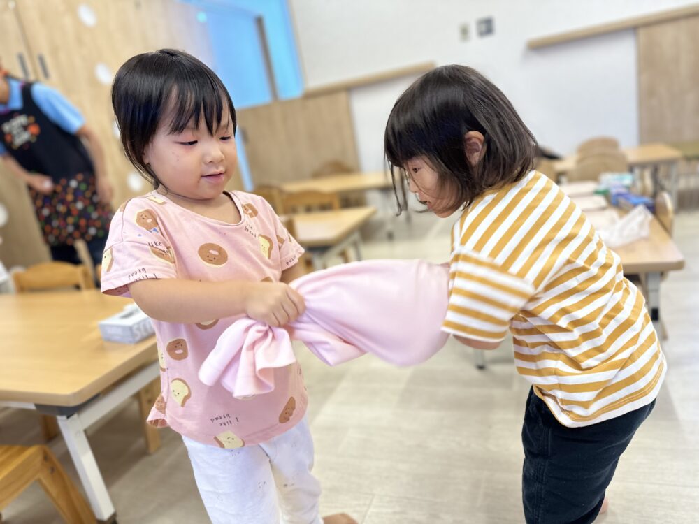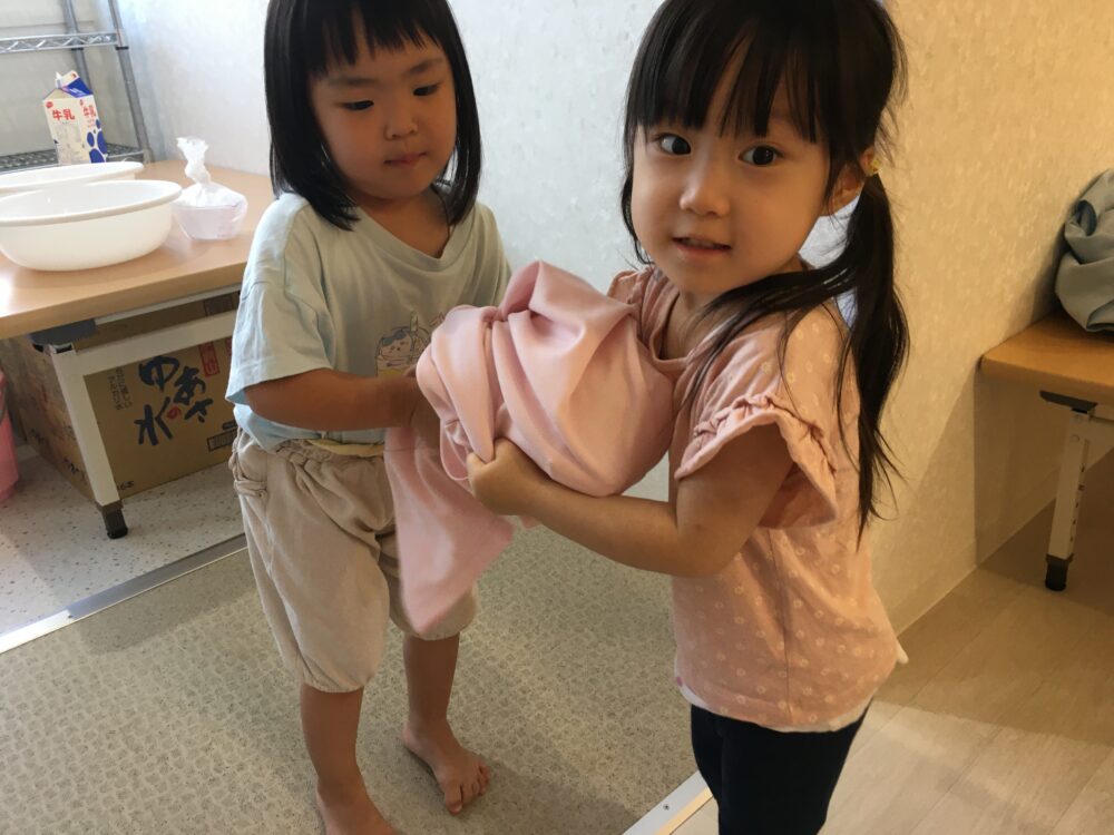 次は、氷と一緒にポロシャツでくるみ、Let`s シャカシャカ!!!材料が落ちないように考えながら工夫して、お友だちと力を合わせ頑張って振りました(o^―^o)