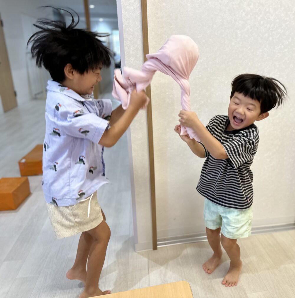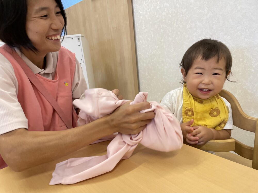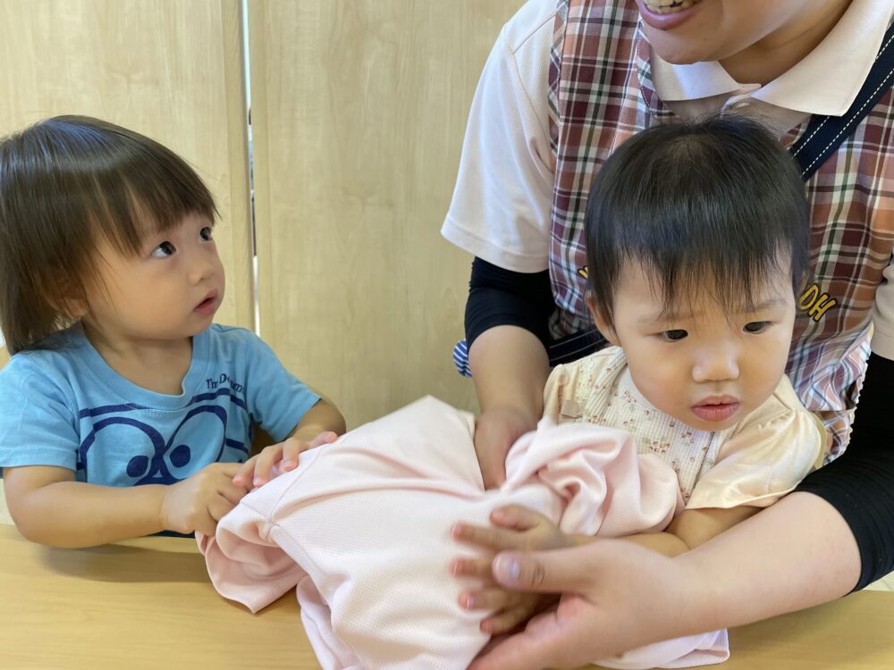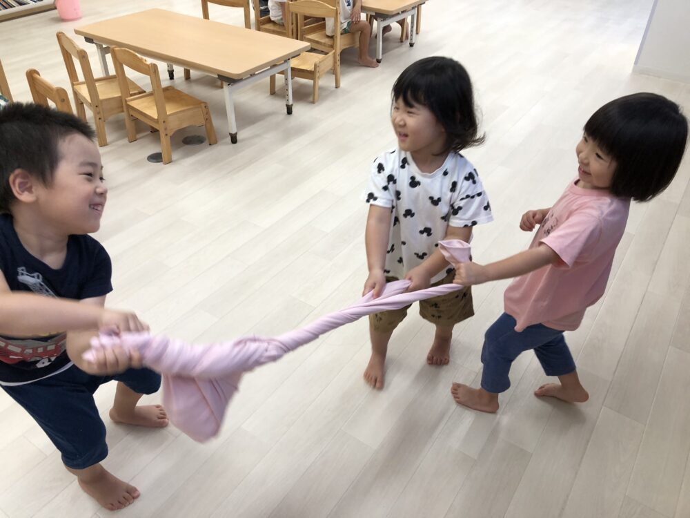 次は、氷と一緒にポロシャツでくるみ、Let`s シャカシャカ!!!材料が落ちないように考えながら工夫して、お友だちと力を合わせ頑張って振りました(o^―^o)