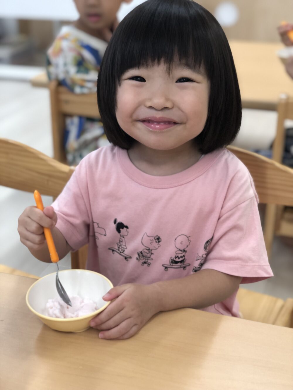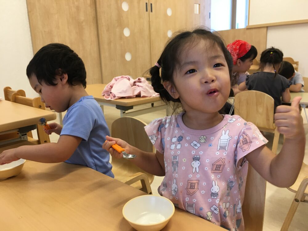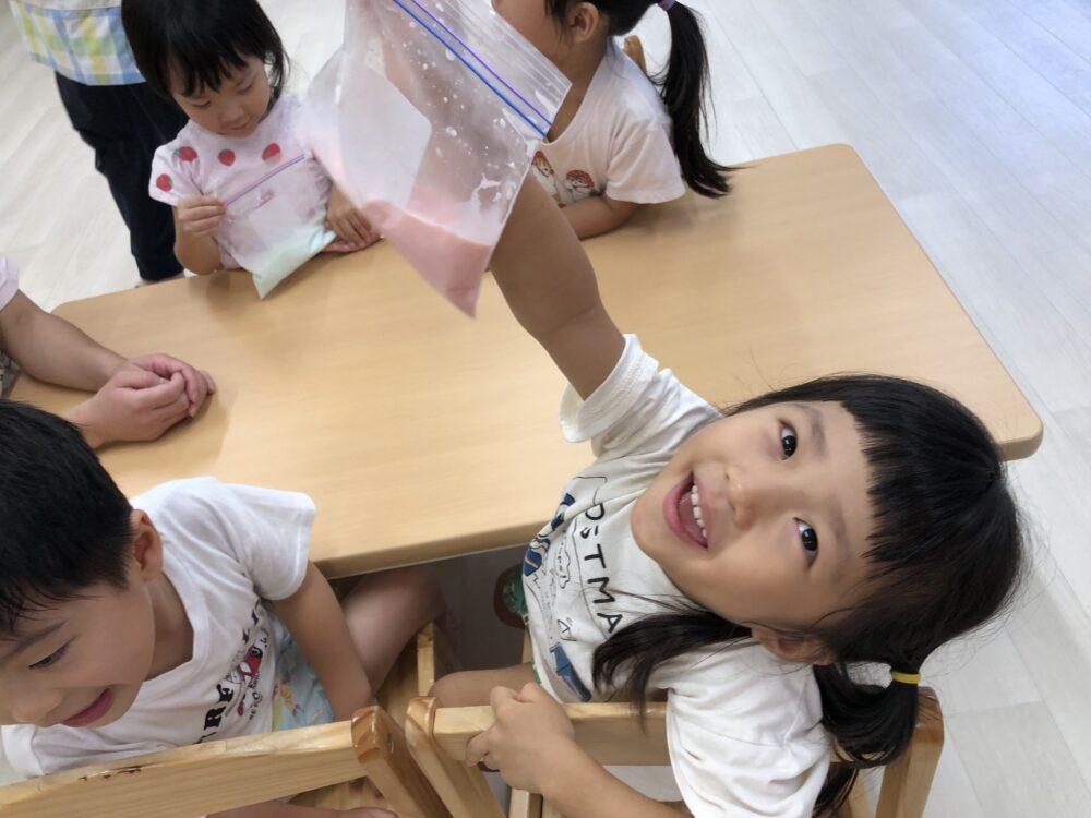 そして、、できあがり♡「すごいね!」「ほんもののアイスだ…」と驚く子どもたち。最初はただの牛乳でしたが、みんなで頑張ってこんなに素敵なアイスを作ることができました!👏👏