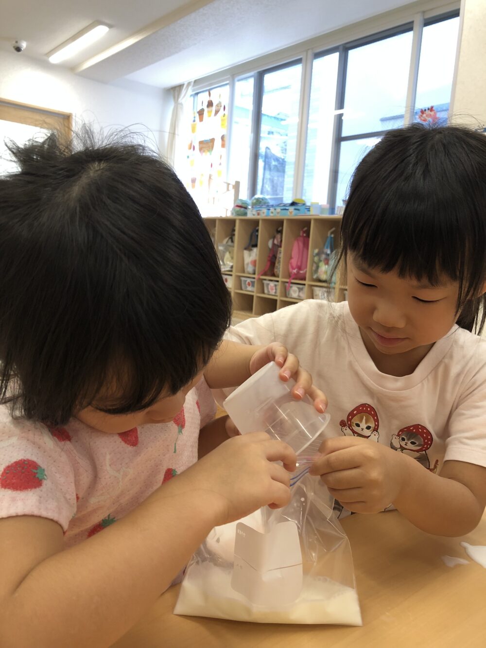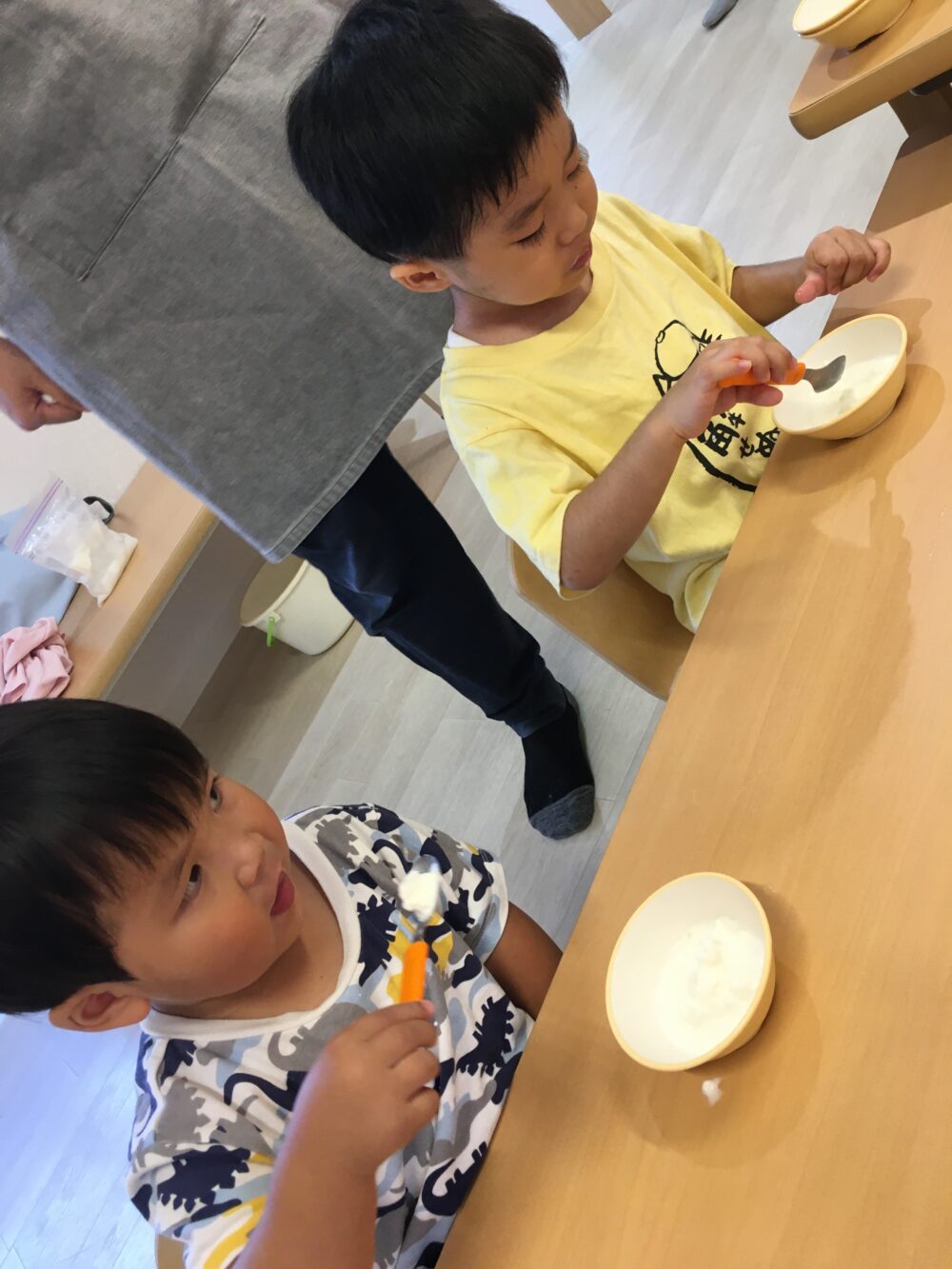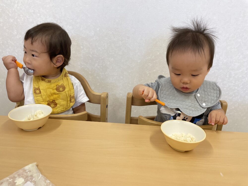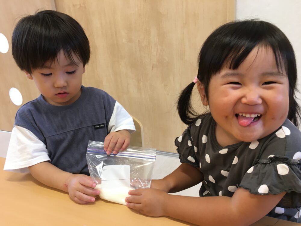 「まだかな~」「もうできたかな?」と、少し振っては中を確認、また少し振っては中を確認するグループや、「がんばるよ!あとでいっしょにたべようね!」と、できあがりを楽しみに夢中になって振り続けるグループと、いろいろな姿が見られました◎