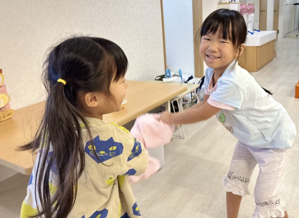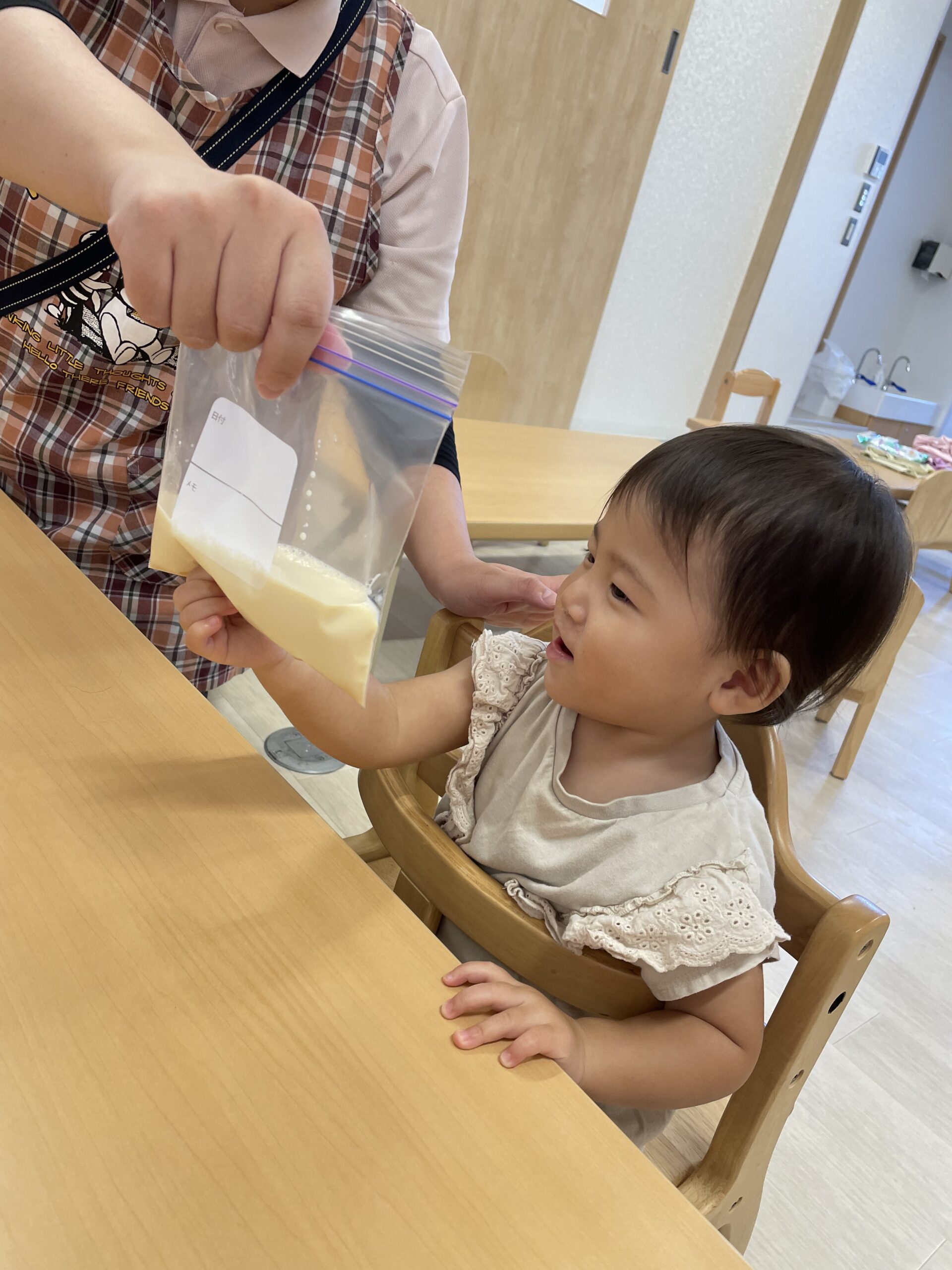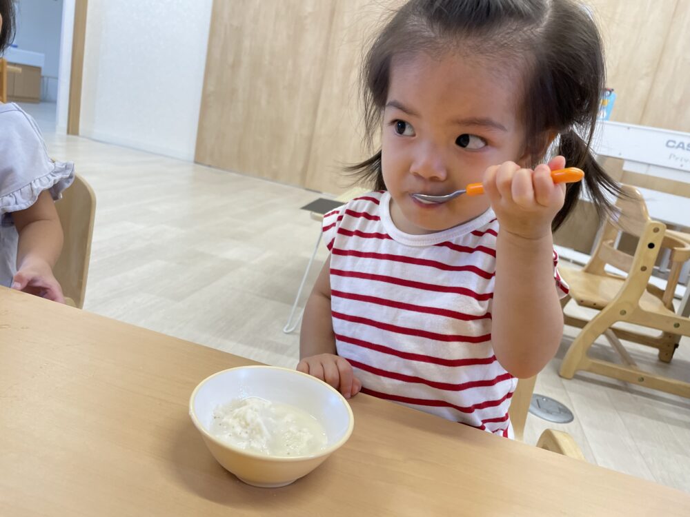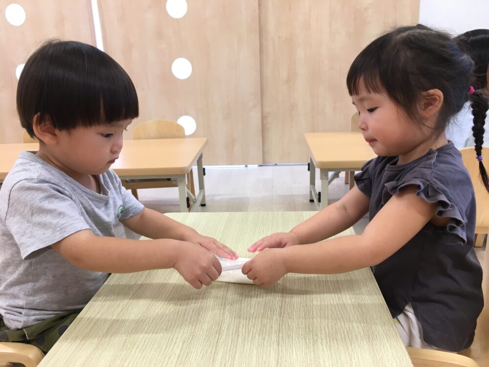 「まだかな~」「もうできたかな?」と、少し振っては中を確認、また少し振っては中を確認するグループや、「がんばるよ!あとでいっしょにたべようね!」と、できあがりを楽しみに夢中になって振り続けるグループと、いろいろな姿が見られました◎