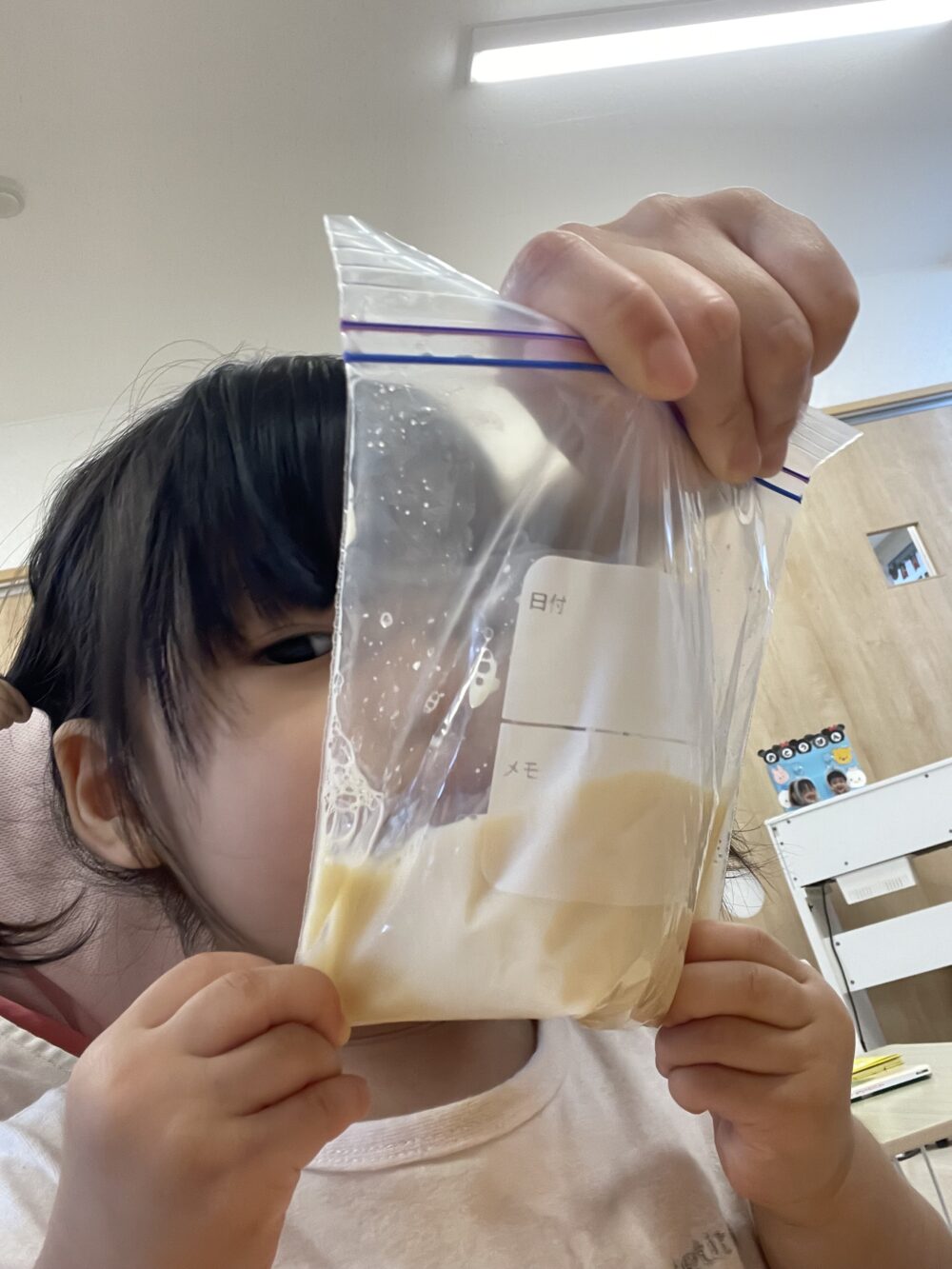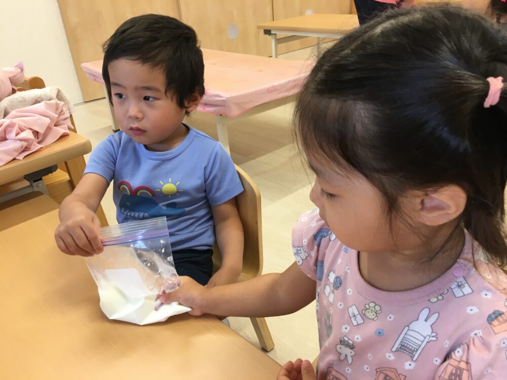 まずは、牛乳の中に砂糖を入れてもみもみ…♪「ただのぎゅうにゅうじゃん」「これがほんとうにアイスになるの~?」と不思議が止まらない子どもたち。。笑