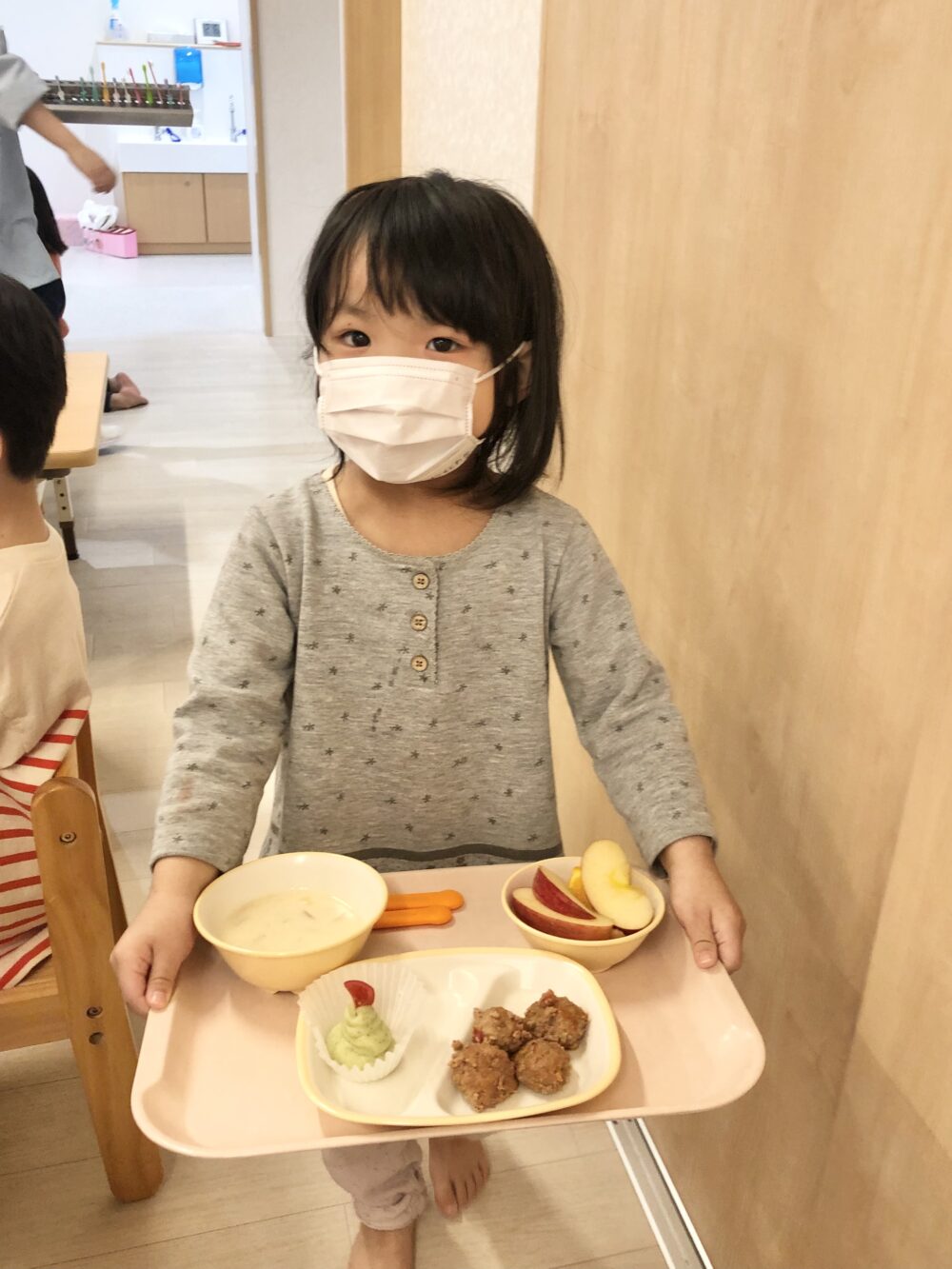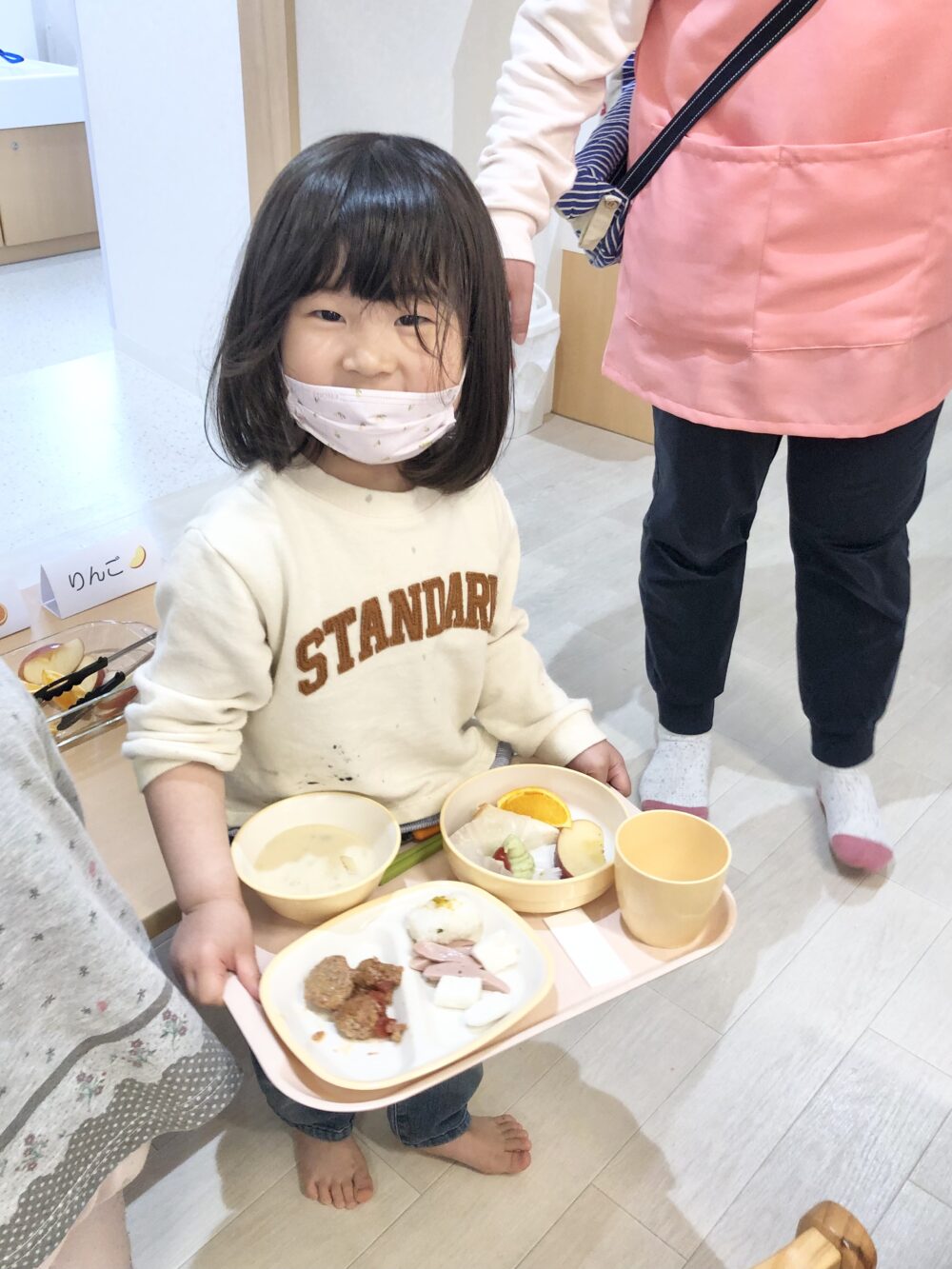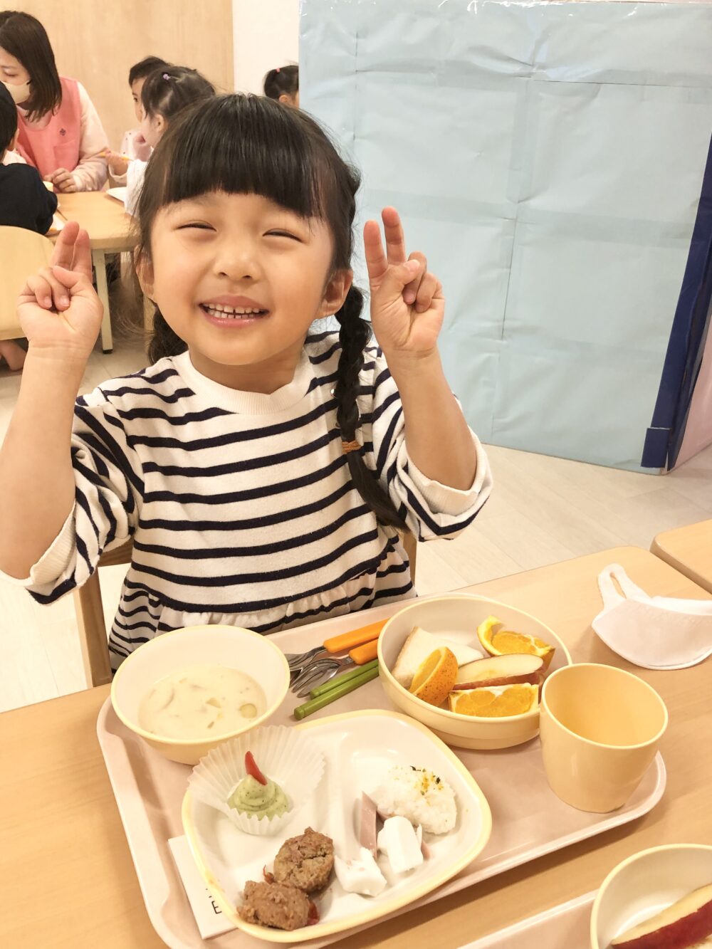 自分で盛りつけた給食!みんなで美味しくいただきます♡