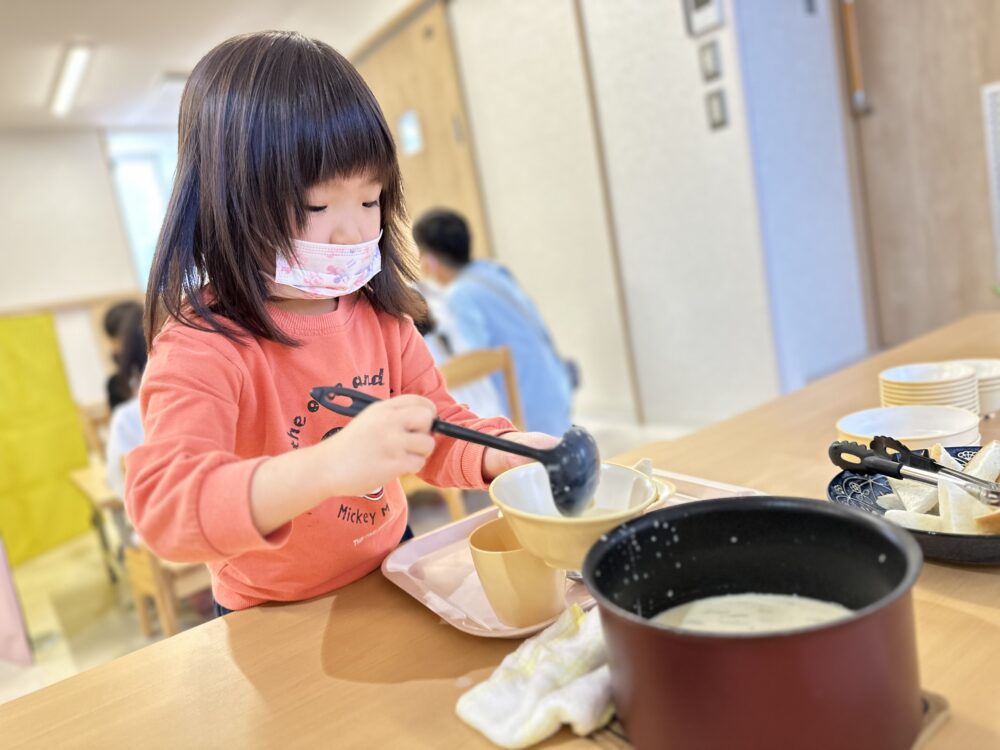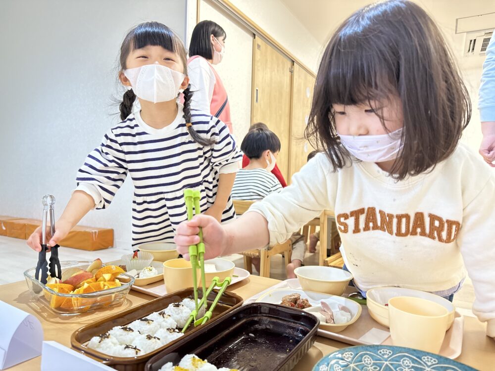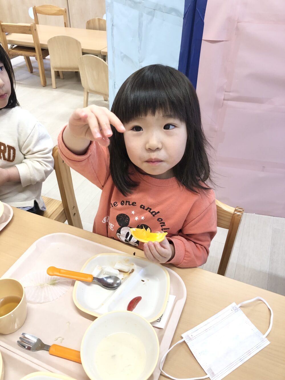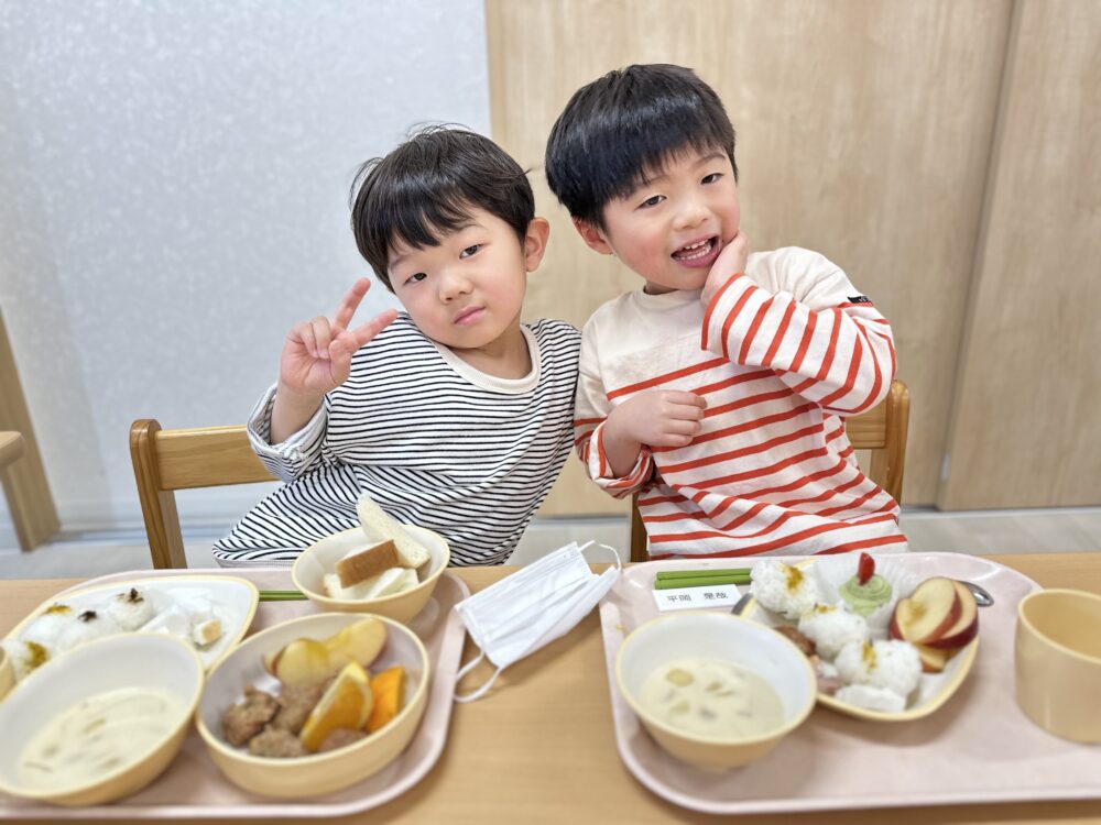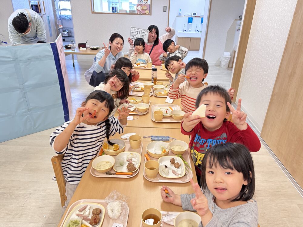 自分で盛りつけた給食!みんなで美味しくいただきます♡