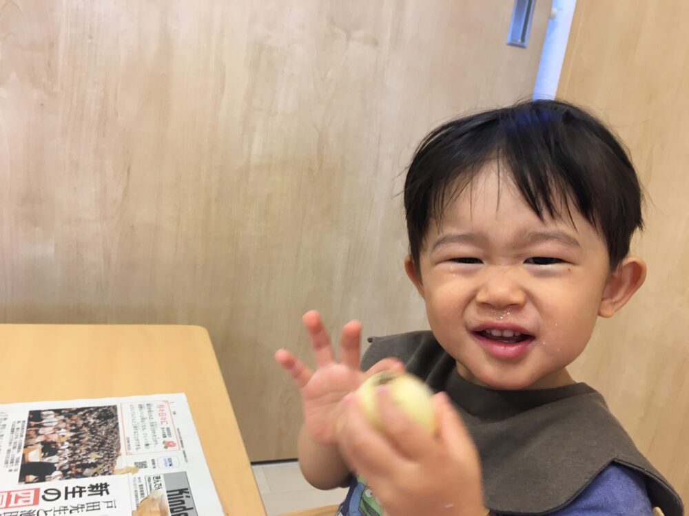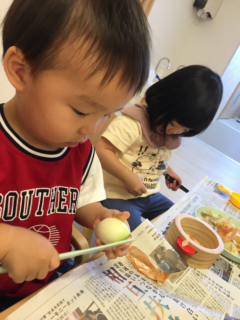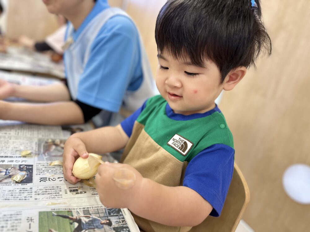 小さな指で、少しずつ剥きツルツルの玉ねぎが出てきてにっこり!
